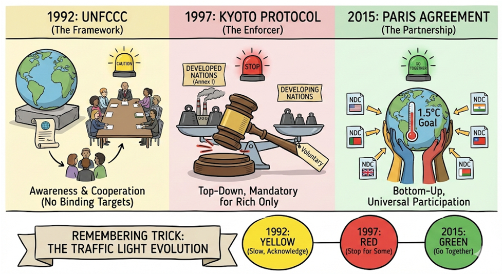 Different Timelines: It recognized “Common but Differentiated Responsibilities” (Rich countries act first).