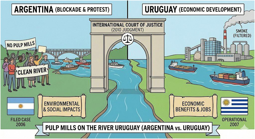 Uruguay wanted to build paper mills (pulp mills) on a river it shares with Argentina. Argentina was terrified the mills would pollute the river and smell terrible. Argentina sued, claiming Uruguay didn’t ask for permission properly. The court found that Uruguay was rude (didn’t follow procedure) but the mills weren’t actually dangerous.