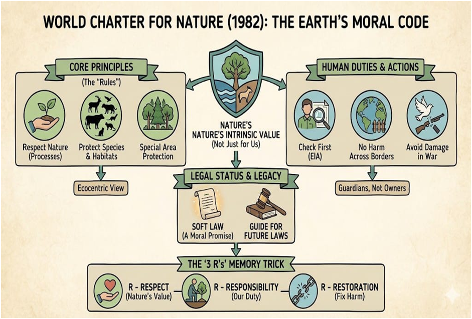 - Ecocentric View: Most laws are “Anthropocentric” (focused on humans). This Charter is “Ecocentric” (focused on nature itself).