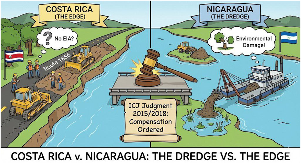 Nicaragua dug channels in a border river (dredging) and cut down Costa Rica’s trees. Costa Rica retaliated by building a road right next to the river, dumping dirt into it. It was a messy border fight. The unique thing here is that for the first time, the court put a price tag on the trees and nature destroyed.
